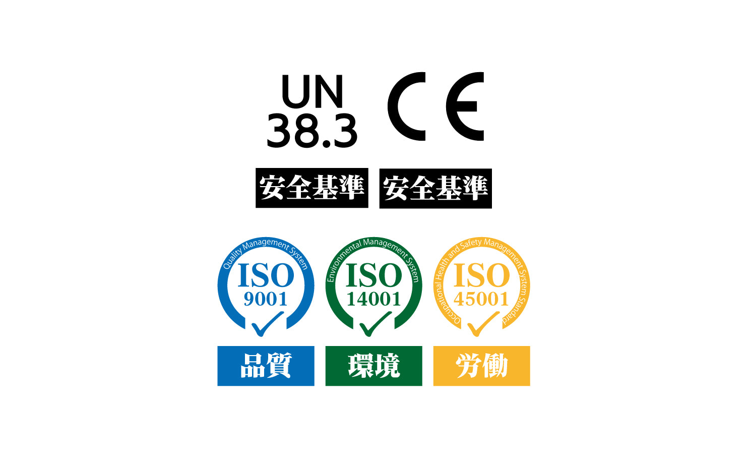 ISO9001(品質)、ISO14001(環境)、ISO45001(労働安全衛生)などの国際認証に加え、UL、CE、INMETROなど国内外の認証も多数取得しています。